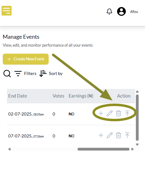 Note: You might need to scroll sideways to access the event management icons on your phone, especially if your screen is small.