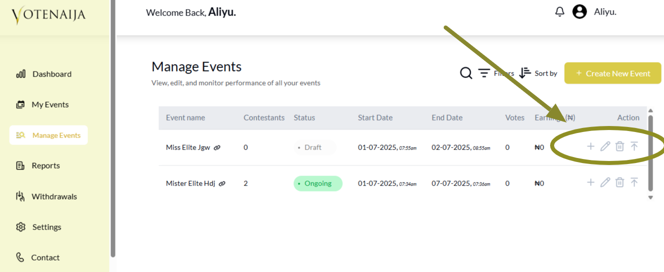 You’ll see a list of your events, each with icons beside it. These icons let you: