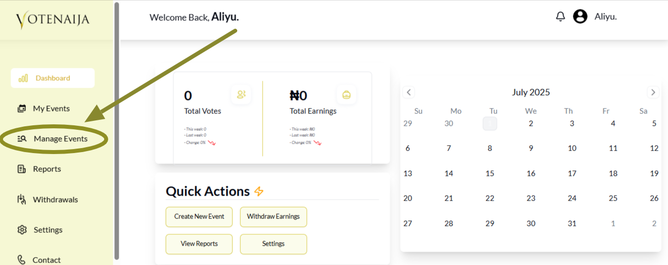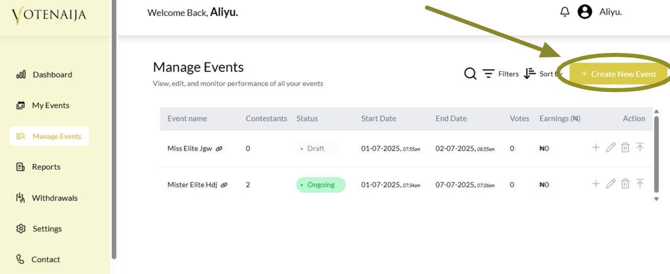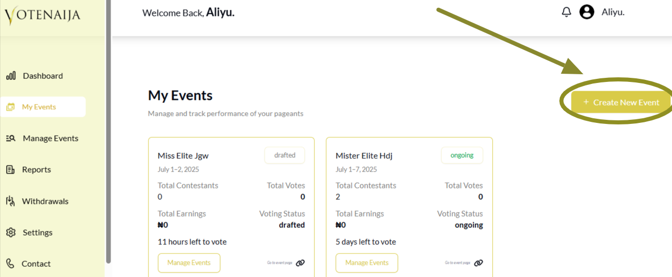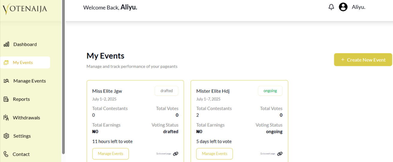 Manage Events is where you go when you want to make changes, add contestants, or publish your event.