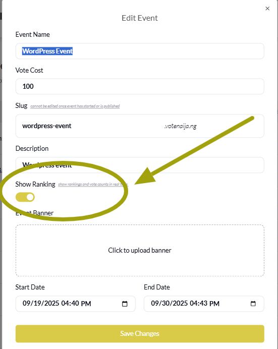 After logging into your VoteNaija account, head over to your dashboard and select the event you want to adjust. Inside the event settings, you will find the option titled “Show Ranking.”