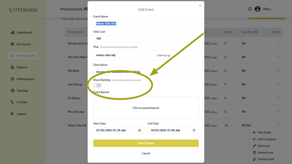From your admin panel, you can turn the “Show Ranking” option on or off at any time. This gives you full flexibility—whether you want to highlight the top three contestants with their vote counts or keep things fairer by hiding the leaderboard.