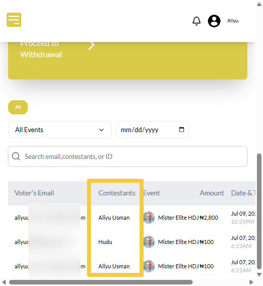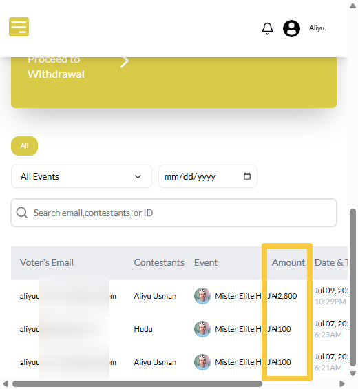 By checking the voter email alongside the contestant and amount, you can clearly understand each voting action.