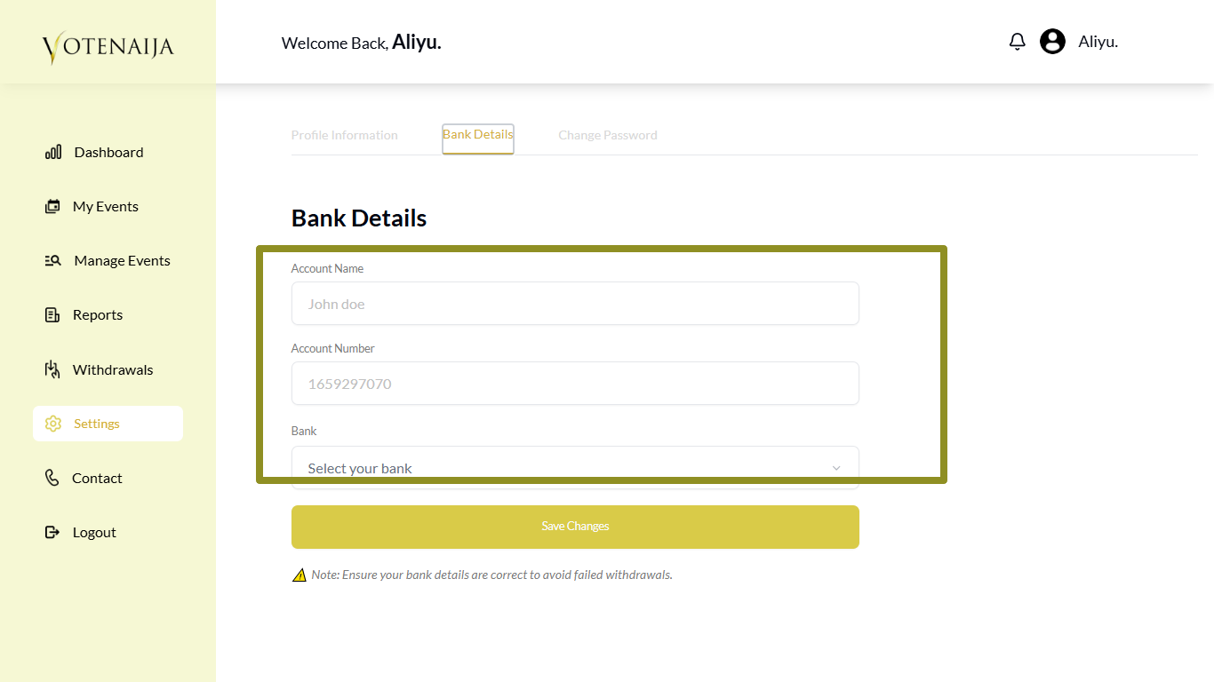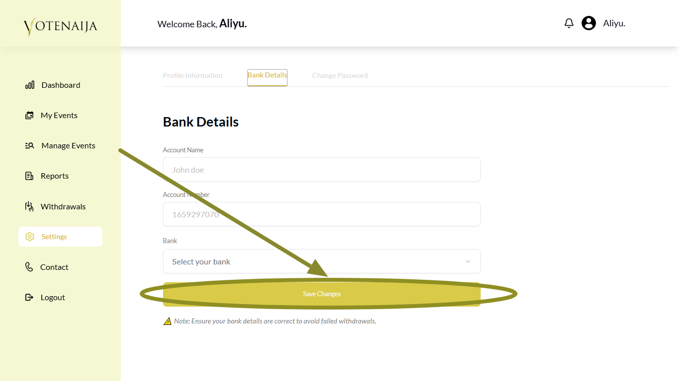 This will save your bank account details to your profile. From that point on, every time you request a withdrawal, VoteNaija will use these saved details.