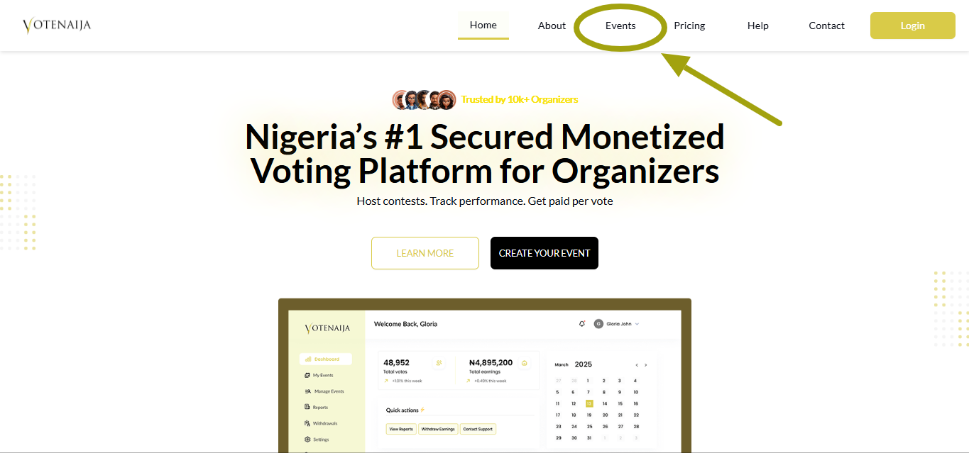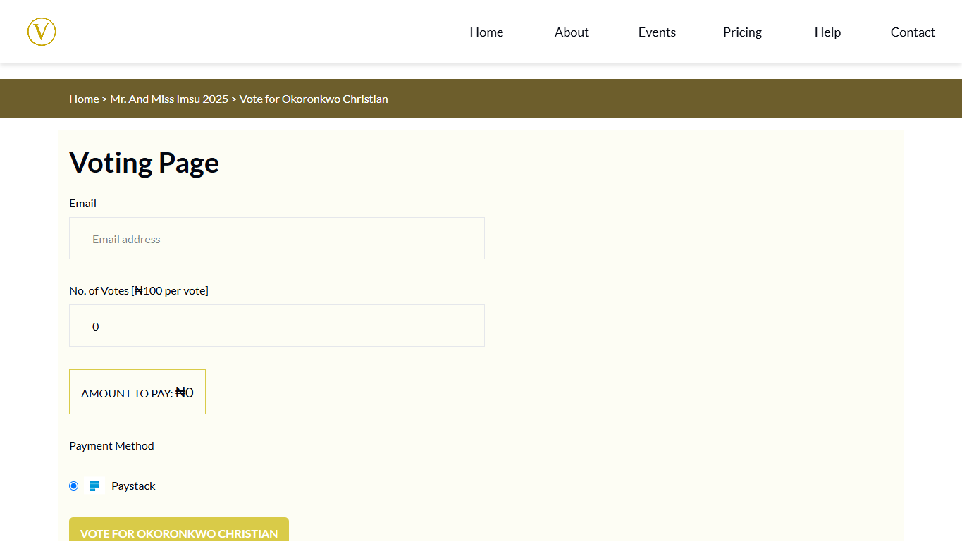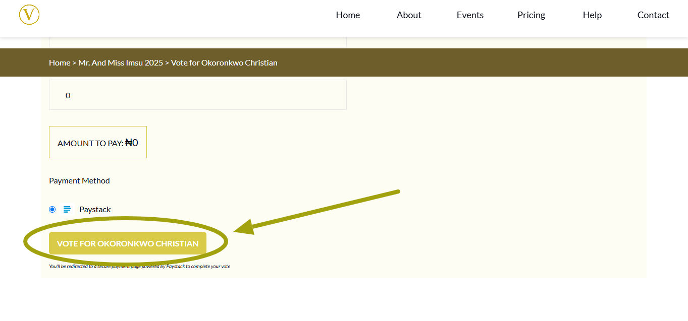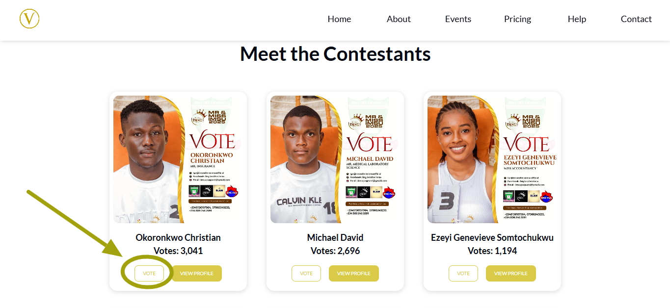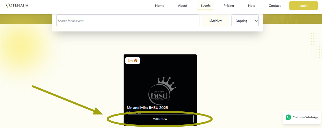 Visit the VoteNaija homepage using your browser. From there, go to the Events section. Scroll through the list of ongoing or upcoming events and pick the one you are interested in.