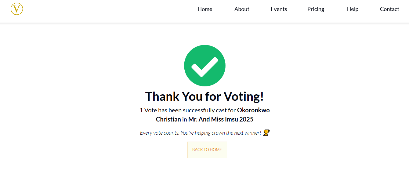 After a successful payment, VoteNaija will take you to a thank-you page that confirms your vote. You can return to the event page to see that your chosen contestant’s vote count has increased.