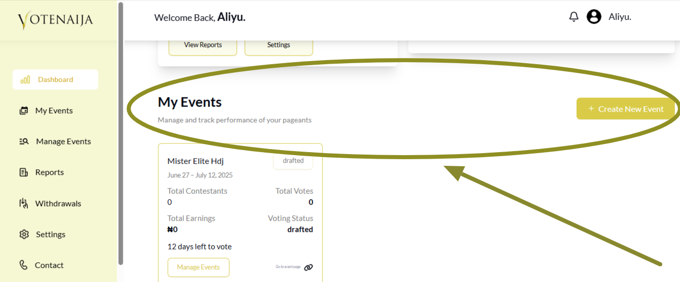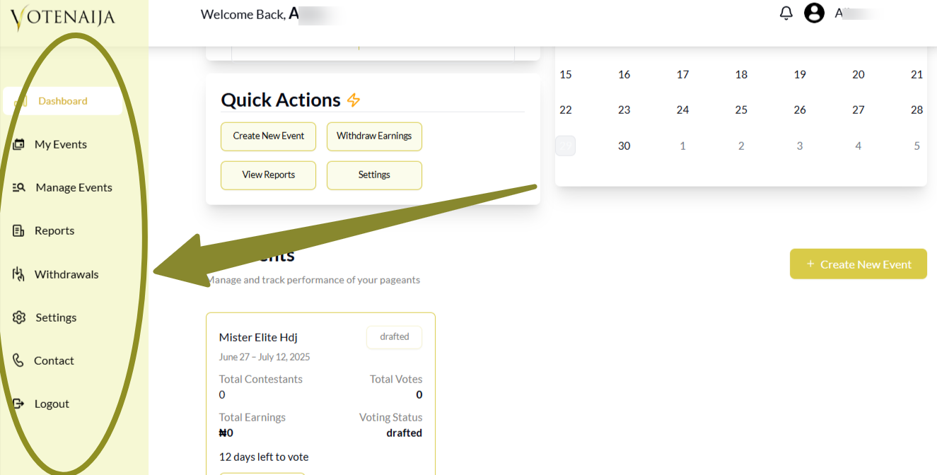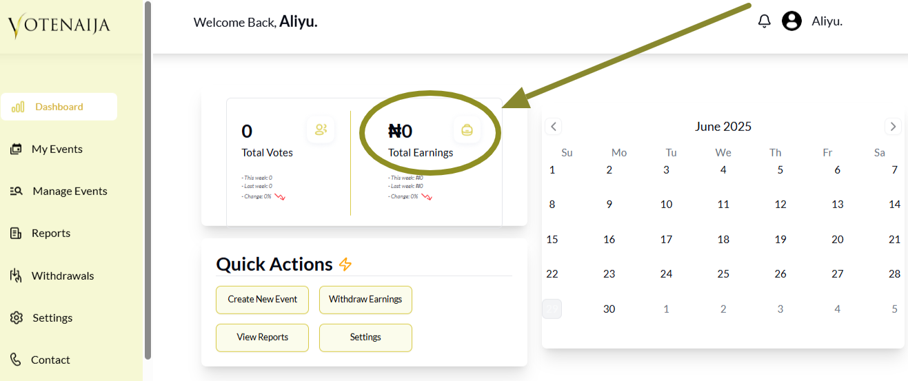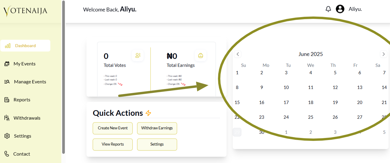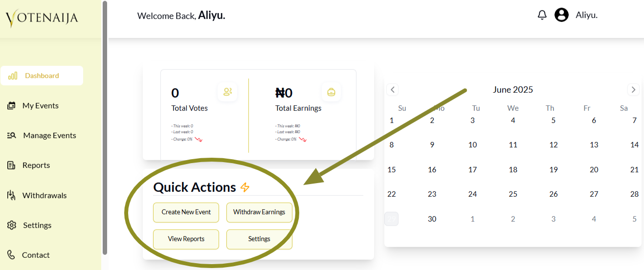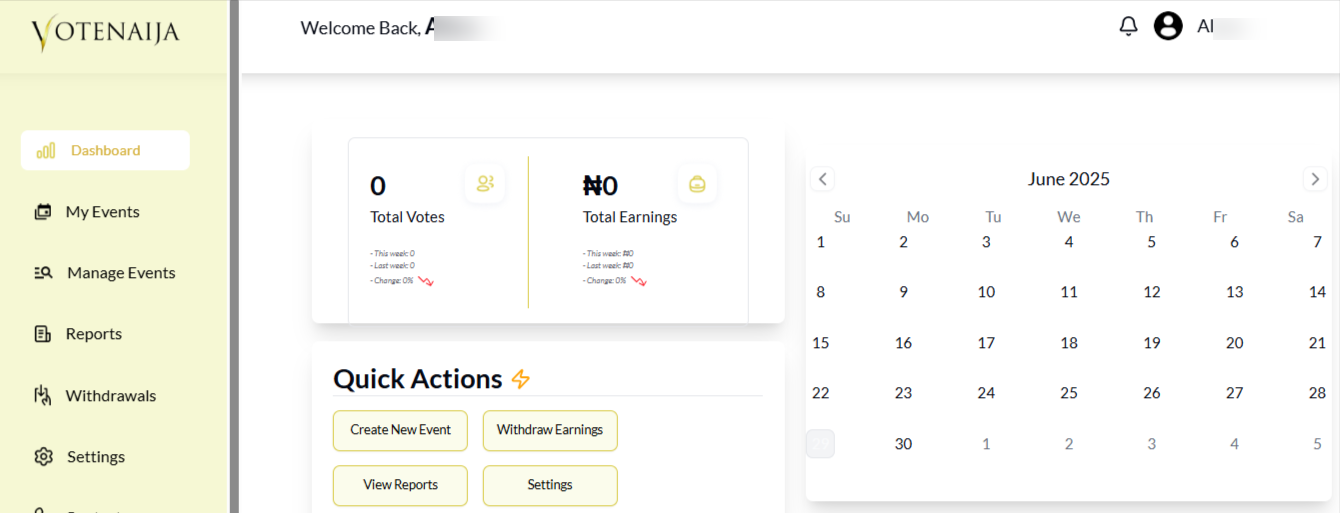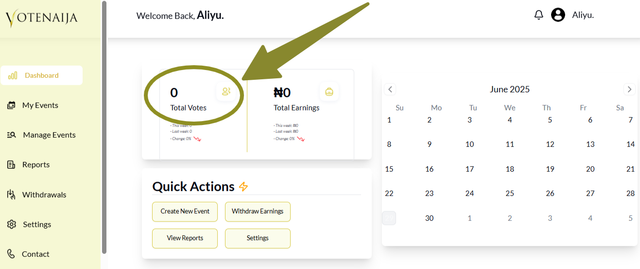 If you’re using VoteNaija on a computer, your dashboard is the place where everything happens. From tracking your performance to managing events, the dashboard gives you full control over your activities.