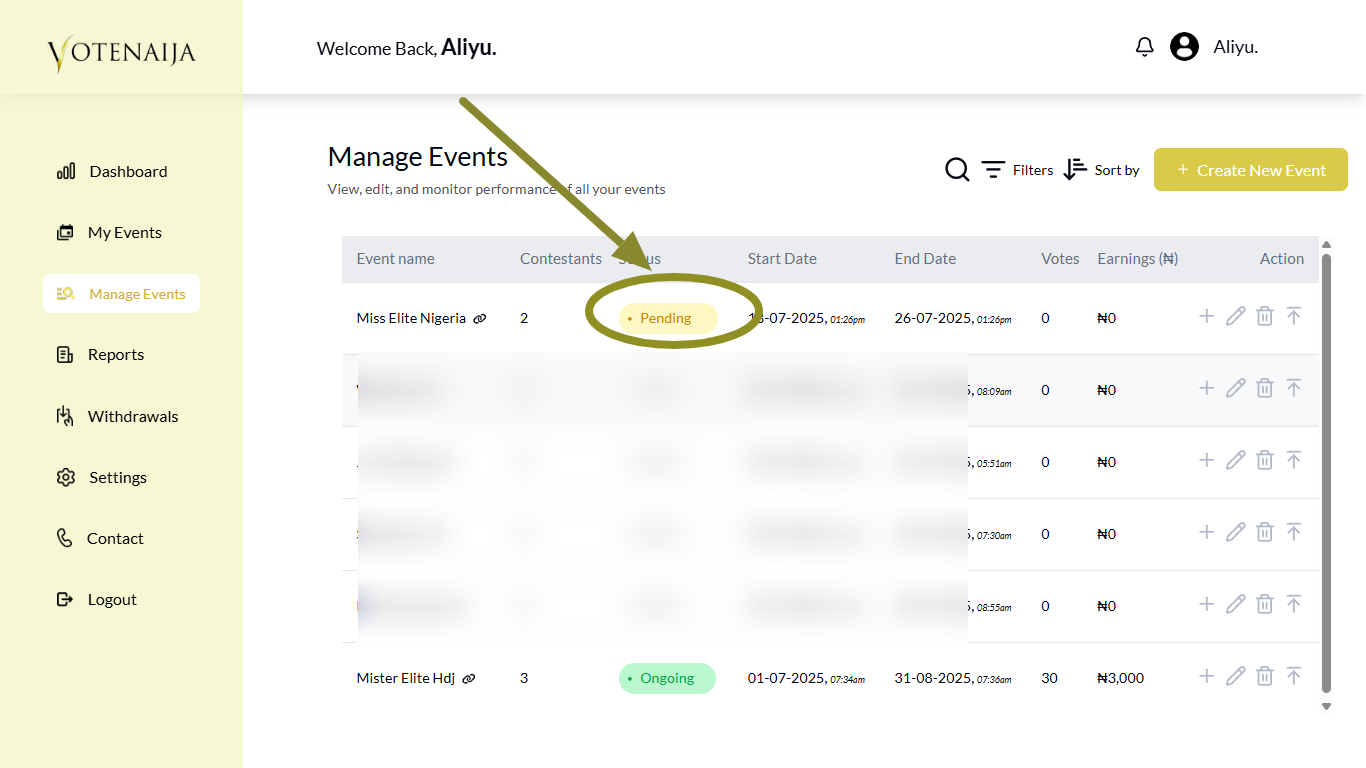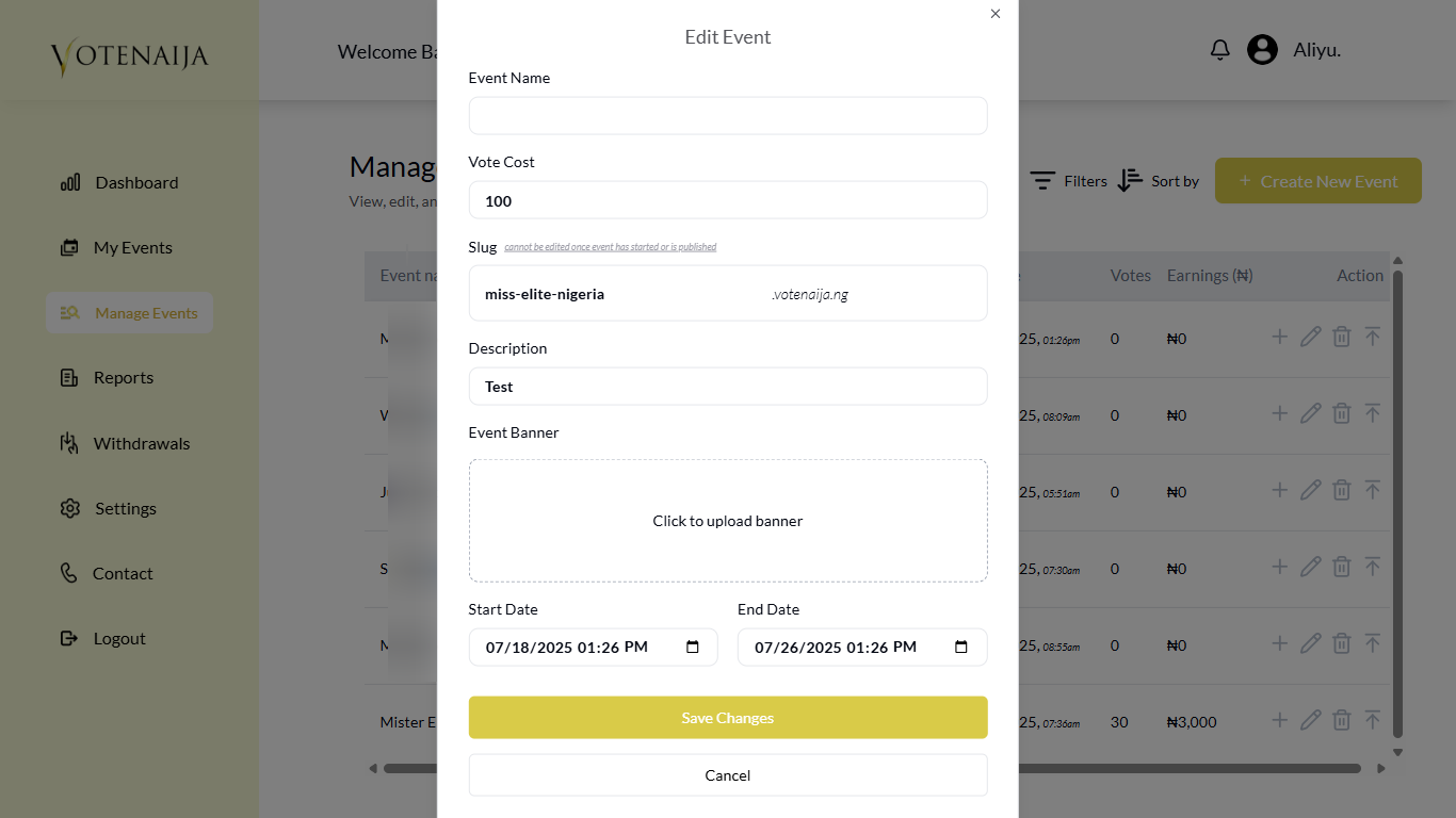 After publishing your event, the VoteNaija team begins reviewing it to make sure everything looks fine. They check if the event name, description, and other settings are correct before approving it and allowing the public to start voting. This review is important for keeping the platform clean and trustworthy.