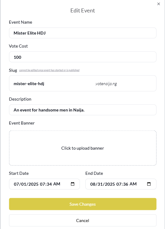 Once your event is live, some details cannot be changed from your dashboard. This includes the event name, the link, voting cost, and even removing contestants.
