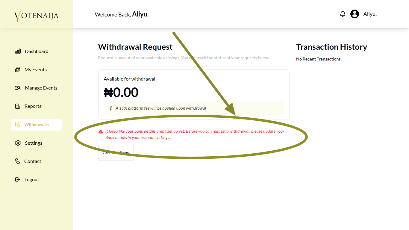 “It looks like your bank details aren’t set up yet. Before you can request a withdrawal, please update your Bank details in your account settings.”
